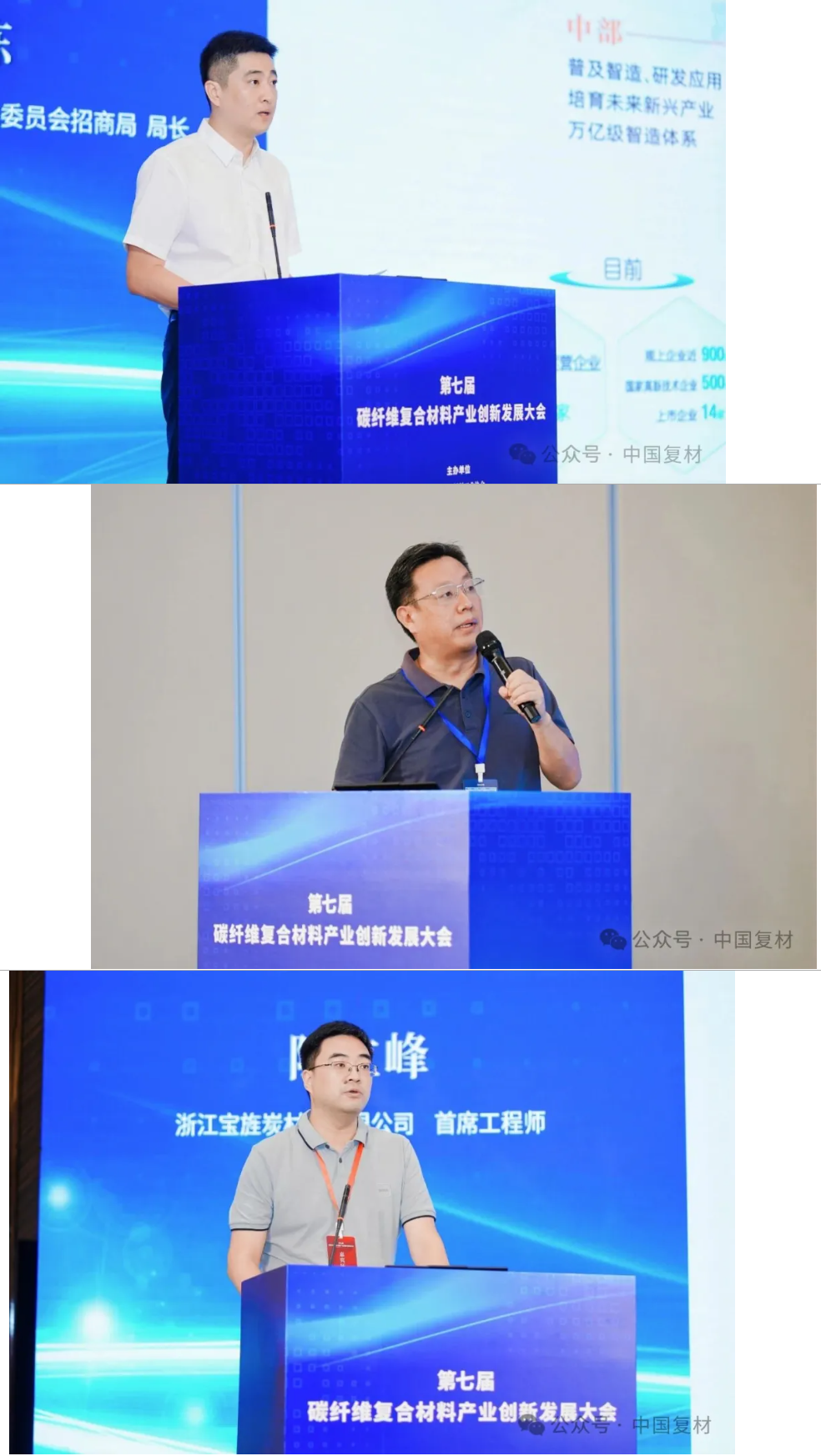 绍兴柯桥经济技术开发区管理委员会招商局局长李栋做《“创”在金开 “新”向未来—柯桥经开区的招商推介》,点明投资柯桥 “金坐标” 与高效环境;浙江省现代纺织产业技术创新中心副主任敖玉辉作《碳纤维及其复合材料发展现状与应用技术研究》,以数据梳理情况并展望趋势;浙江宝旌炭材料有限公司首席工程师陈立峰进行企业推介借案例展现实力,详解技术与质量把控,为同行提供参考。